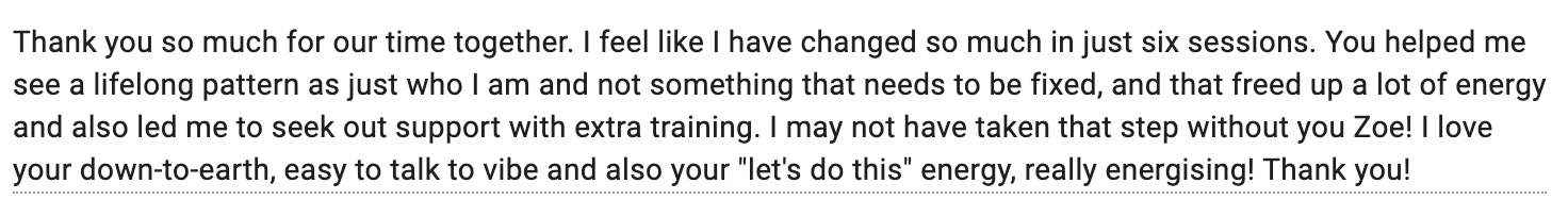 I offer that depth of work to people who are done being held back by old stories, outdated beliefs and nervous system activation - with the added gift of guidance.